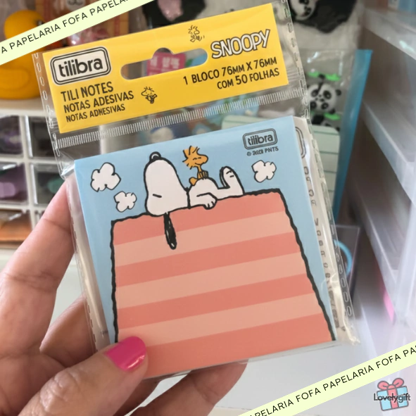 01 Bloco Adesivo Tili Notes Snoopy: Possui 50 folhas reposicionáveis no tamanho 76mm x 76mm. É ideal para anotar ideias e lembretes sem danificar o papel.